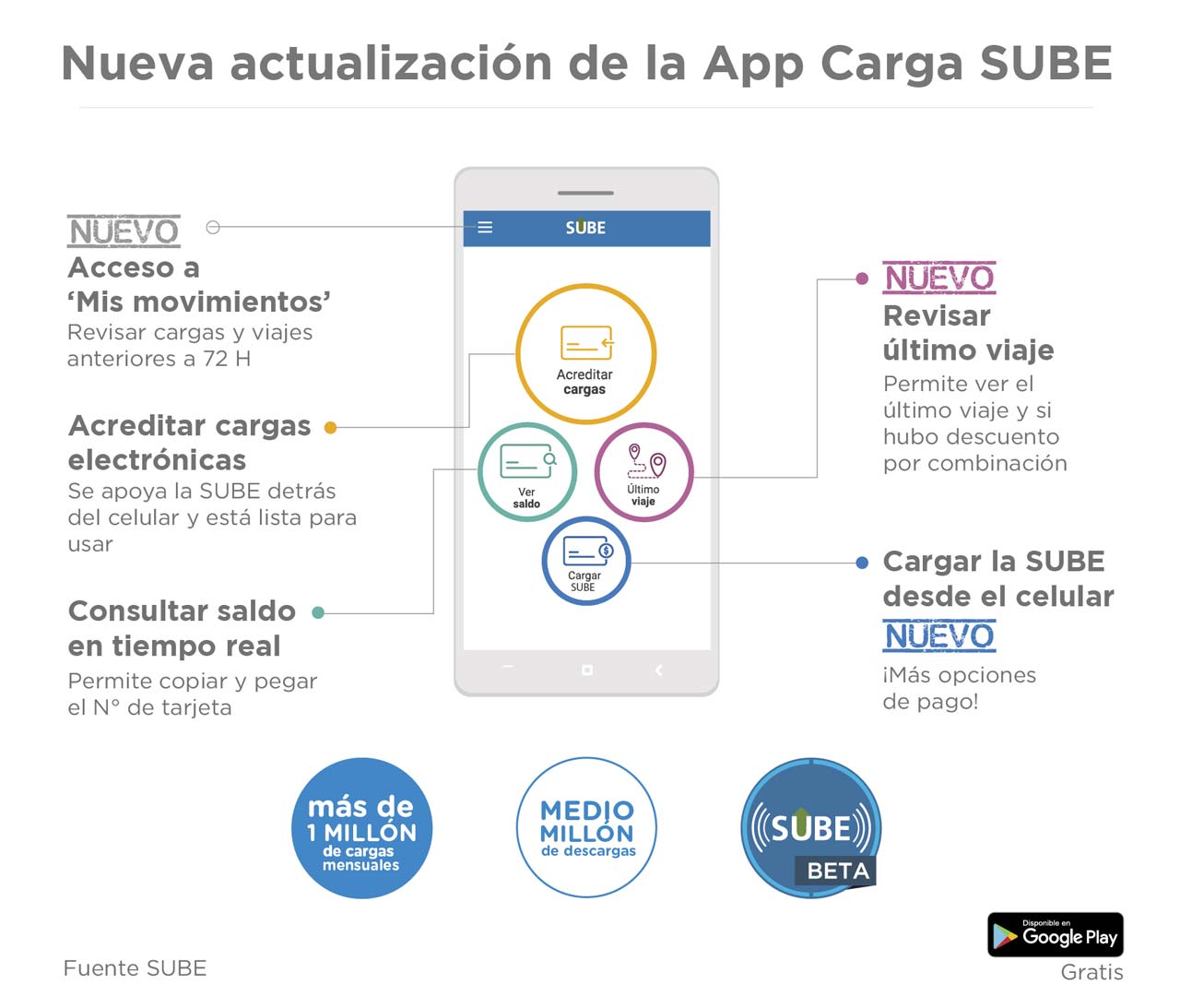 La aplicación permite, con solo apoyar la SUBE detrás del celular con el NFC activado, elegir cómo cargar, acreditar las cargas, ver el saldo actual y acceder a la información del último viaje realizado: indicará qué medio utilizó el usuario, su fecha, hora y se le notificará si se recibió descuentos por combinación.