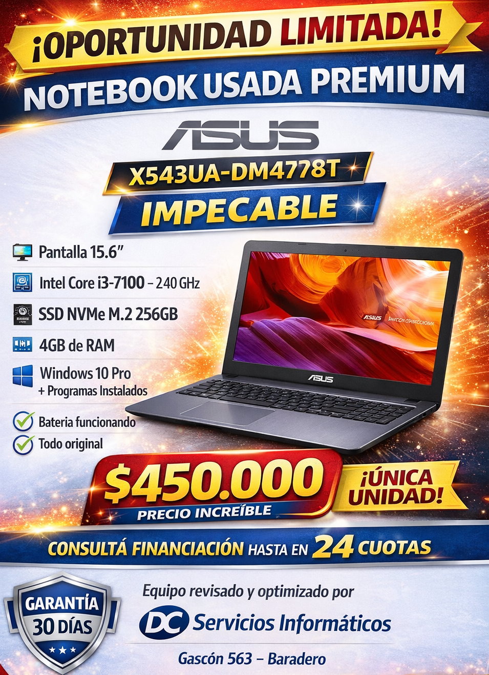 Notebook Asus impecable, totalmente revisada y optimizada por DC Servicios Informáticos, lista para usar desde el primer momento. Ideal para estudio, trabajo de oficina, navegación por internet y uso diario.
