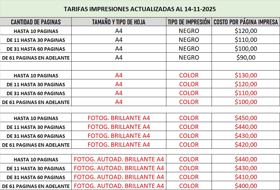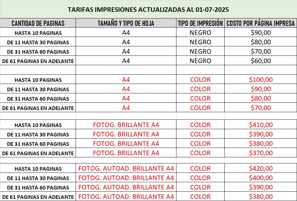 El costo de la impresión puede variar según el tipo de archivo, cantidad de páginas, uso de color y formato. Te recomendamos consultarnos previamente para confirmar el precio final.